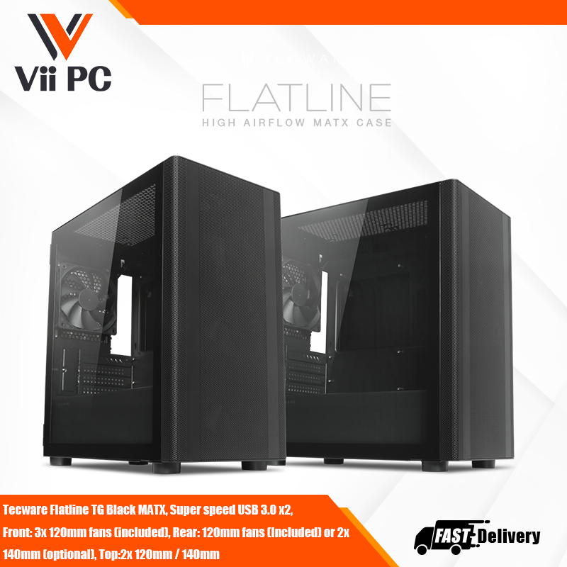 TECWARE Flatline TG Black MATX, Super speed USB 3.0 x2, Front: 3x 120mm fans (included), Rear: 120mm fans (Included) or 2x 140mm (optional), Top:2x 120mm / 140mm